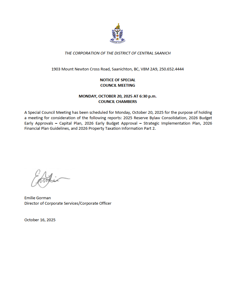 The District of Central Saanich acknowledges it is situated on the traditional territory of the W̱SÁNEĆ people which includes W̱JOȽEȽP (Tsartlip) and SȾÁUTW̱ (Tsawout) First Nations.
