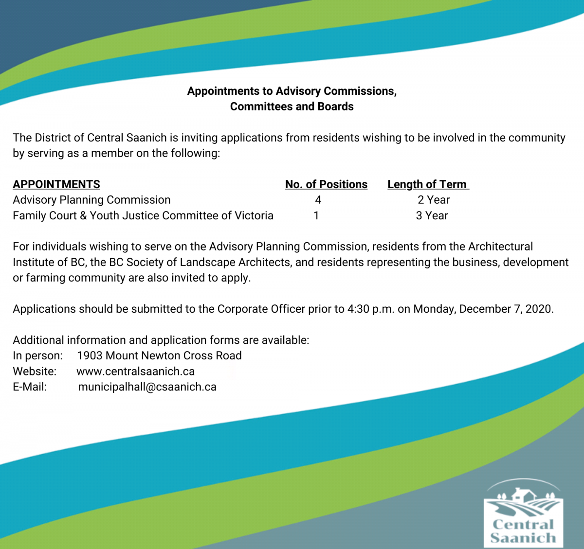 Please fill out the application form (also available at Municipal Hall at 1903 Mount Newton Cross Road) and submit to the Corporate Officer by emailing municipal.hall@csaanich.ca or at Municipal Hall by 4:30 p.m. on Monday, December 7, 2020.