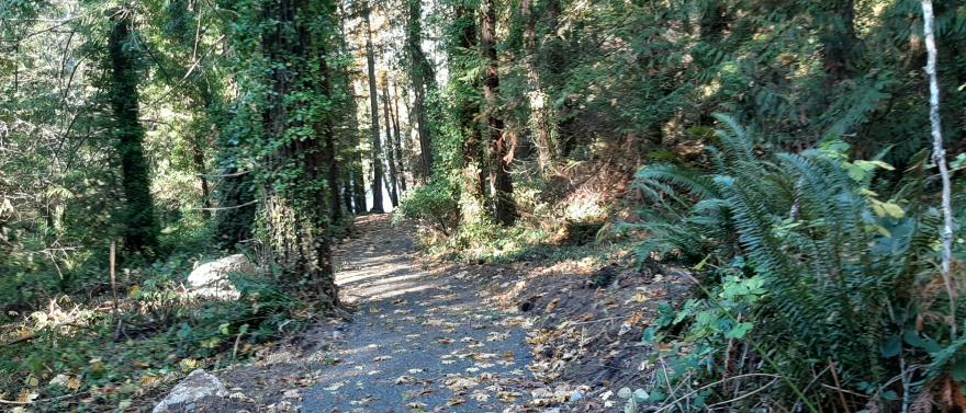 A trail on Mount Newton Cross Road connects West Saanich Road to Wallace Drive. The 1.2 meter-wide gravel trail is suitable for walking, biking and horse-back riding, and is almost entirely separated from the roadway to provide a safety buffer for users from vehicles. The trail meanders through mature trees, including Gerry Oaks and Fir trees, and over a bridge.